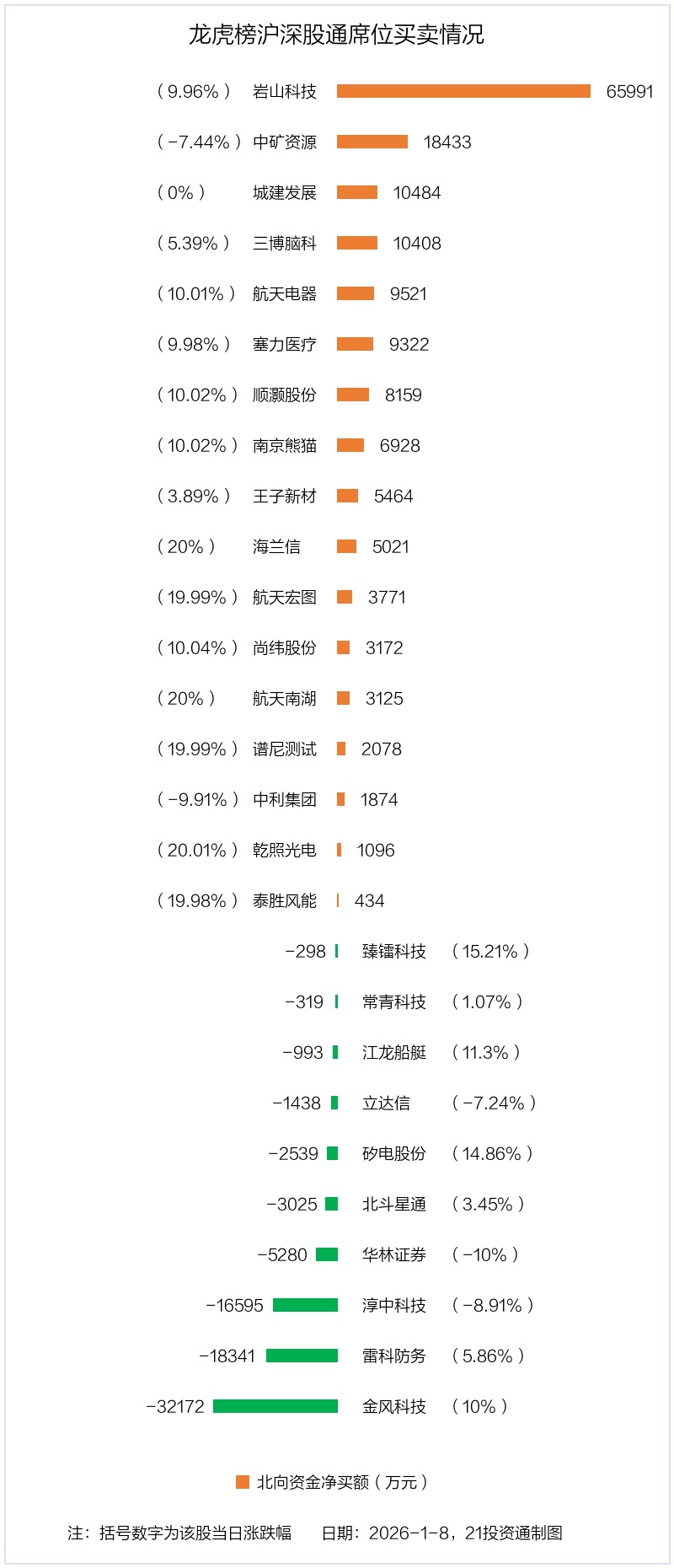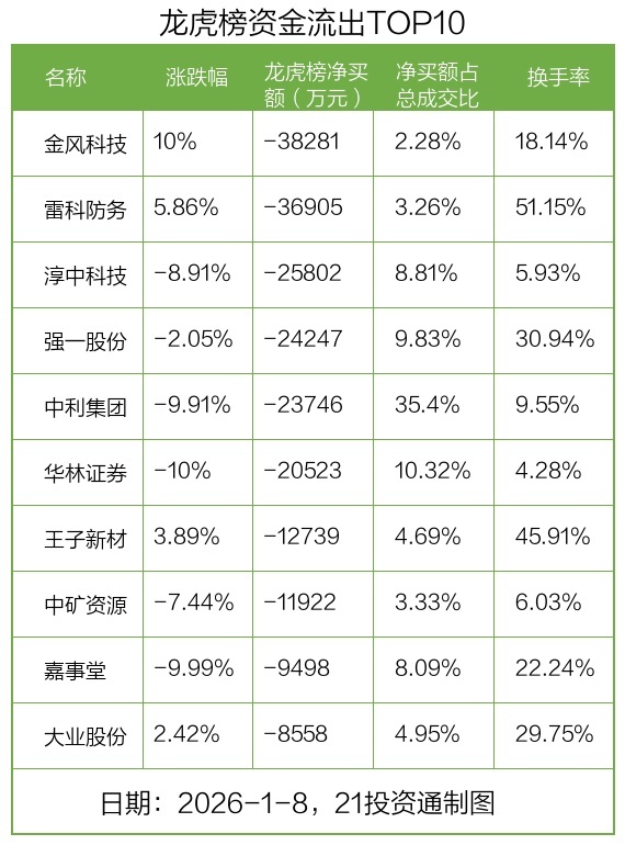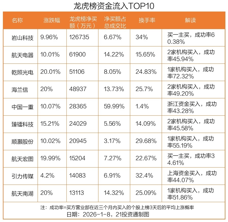 1月8日,上证指数下跌0.07%,深证成指下跌0.51%,创业板指下跌0.82%。盘后龙虎榜数据显示,共有54只个股因当日异动登上龙虎榜,资金净流入最多的是岩山科技(002195.SZ),达12.67亿元。
