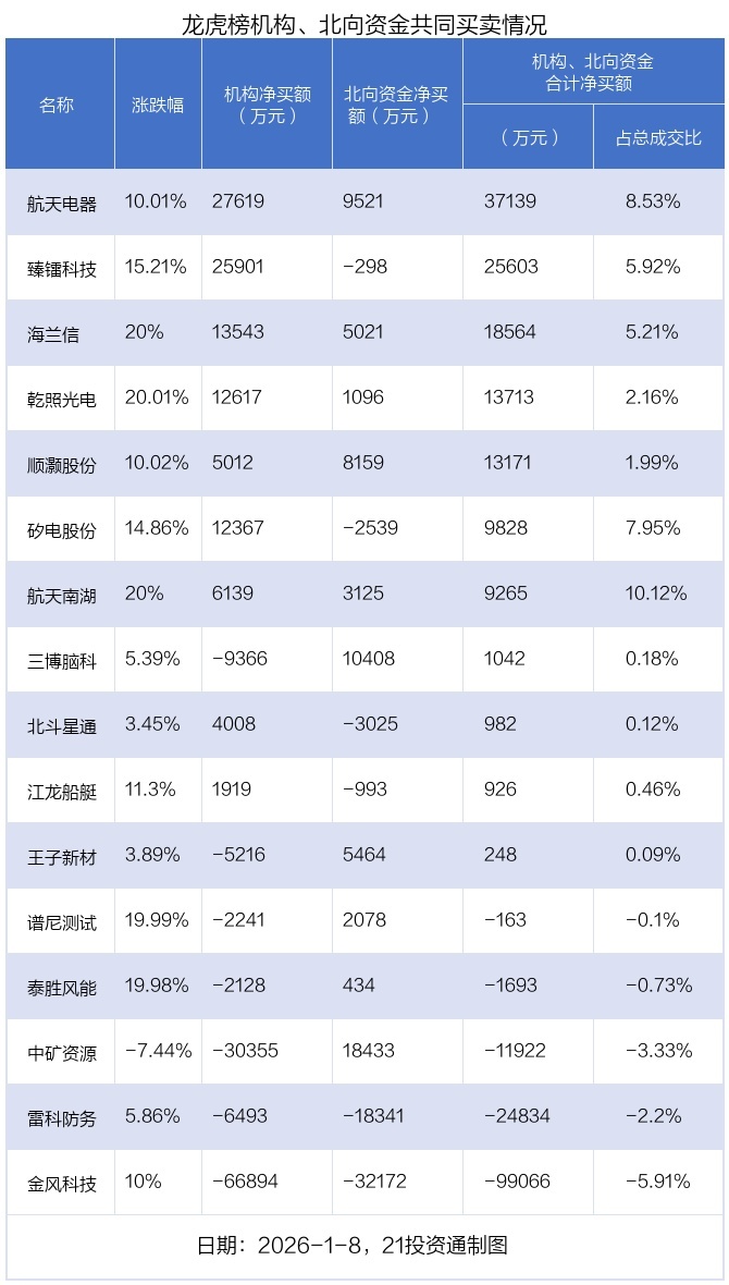 值得注意的是,机构和北向资金共同净买入了航天电器、顺灏股份、海兰信、航天南湖、乾照光电等5股;共同净卖出了雷科防务、金风科技等2股;在中矿资源、三博脑科、王子新材、谱尼测试、泰胜风能、臻镭科技、江龙船艇、矽电股份、北斗星通上出现分歧,机构净卖出中矿资源3.04亿元,北向资金净买入1.84亿元;机构净卖出三博脑科9366.49万元,北向资金净买入1.04亿元;机构净卖出王子新材5215.62万元,北向资金净买入5463.54万元;机构净卖出谱尼测试2241.36万元,北向资金净买入2078.4万元;机构净卖出泰胜风能2127.53万元,北向资金净买入434.09万元;机构净买入臻镭科技2.59亿元,北向资金净卖出298.26万元;机构净买入江龙船艇1919.04万元,北向资金净卖出992.58万元;机构净买入矽电股份1.24亿元,北向资金净卖出2538.9万元;机构净买入北斗星通4007.72万元,北向资金净卖出3025.34万元。