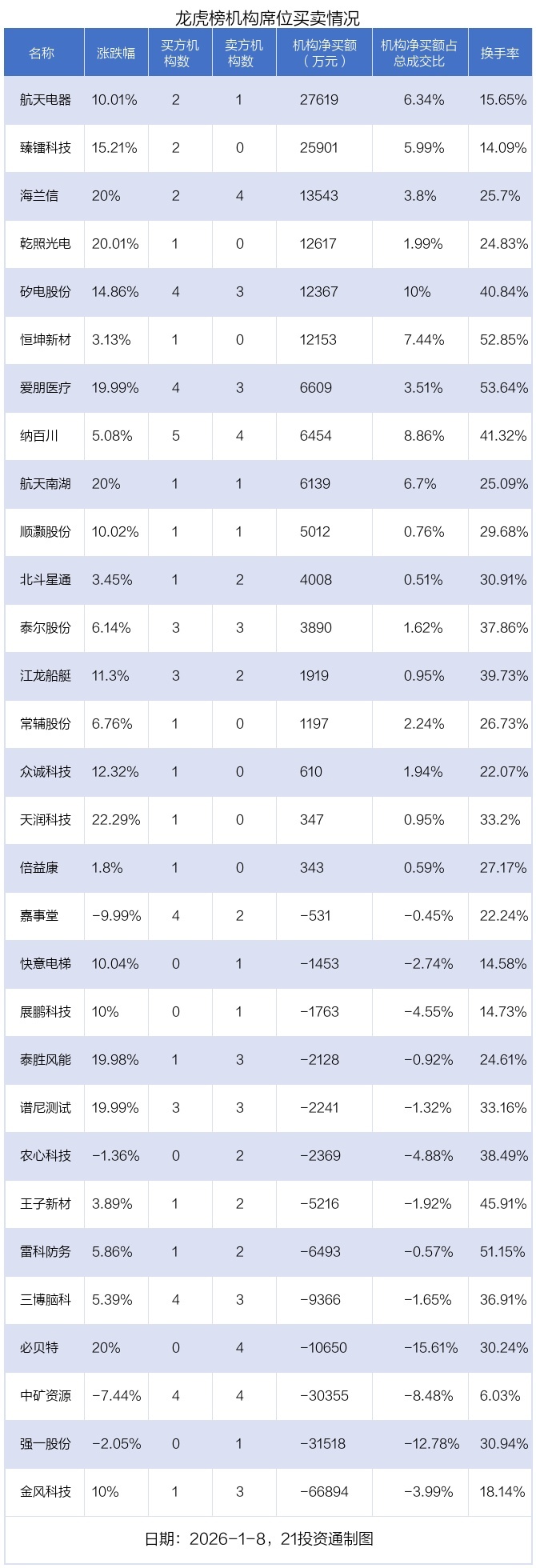 1月8日,30只个股龙虎榜出现了机构的身影,机构合计净卖出3.02亿元。具体来看,机构净买入17股,净卖出13股。